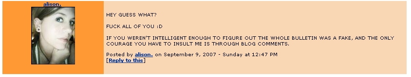 In true MySpace whore fashion, Alison posted a bulletin admitting that her suicide bulletin was a ploy for attention, to see if her friends "really cared". As it turns out, Anonymous was the only one to respond. And now she must suffer the consequences.