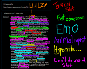 Could quite possibly be worse than her piczo... it's jam-packed with dark colors, stupid emo quotes and all the fatty goodness! She is currently being studied by the great scientists of the world, hoping soon to find a cure of her obesity. According to Micki, standing on a 5 story building is 10,000 miles. She is also an idiot because she posts her address everywhere like she's begging for hate mail.