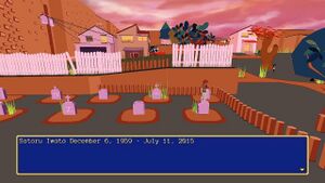 The creators of YIIK therefore wanted to honour this video-game goblin. After all, they had tastefully recreated the Elisa Lam video as a horror movie, if anyone was qualified to do respectful references to the dead, it was the YIIK team. In the shittiest, slumiest town in the whole game, the creators made a graveyard and among a bunch of joke gravestones, added Iwata's rotting corpse and a headstone that broke the 1999 setting to have his real date of death inscribed on it. Somehow, no one on the team realised this was a bad idea until they were swamped with hundreds of angry messages from pissed-off players who felt this tasteless inclusion was unnecessary. Why they didn't just add the man as an NPC or have his picture hidden somewhere is anyone's guess. It's even worse when the grave right next to Iwata's is a grave for the developers, where they suck themselves off "We worked ourselves to death.".