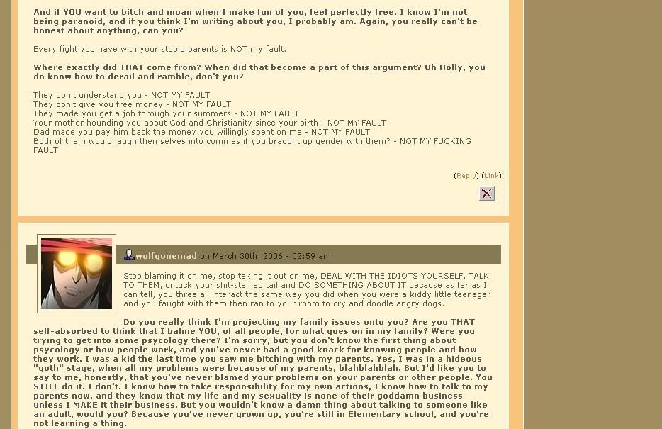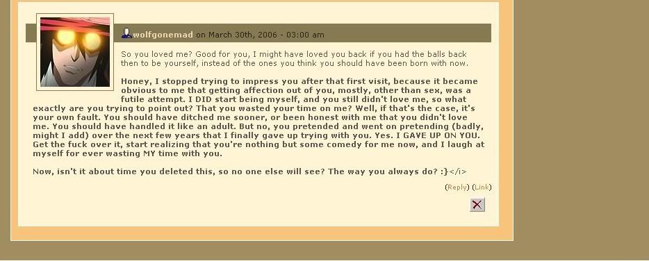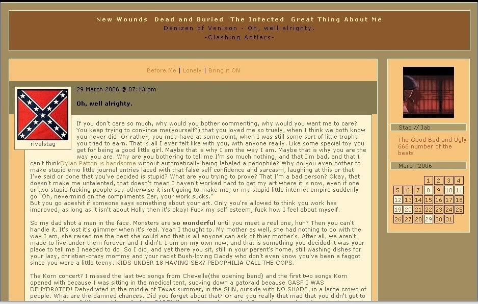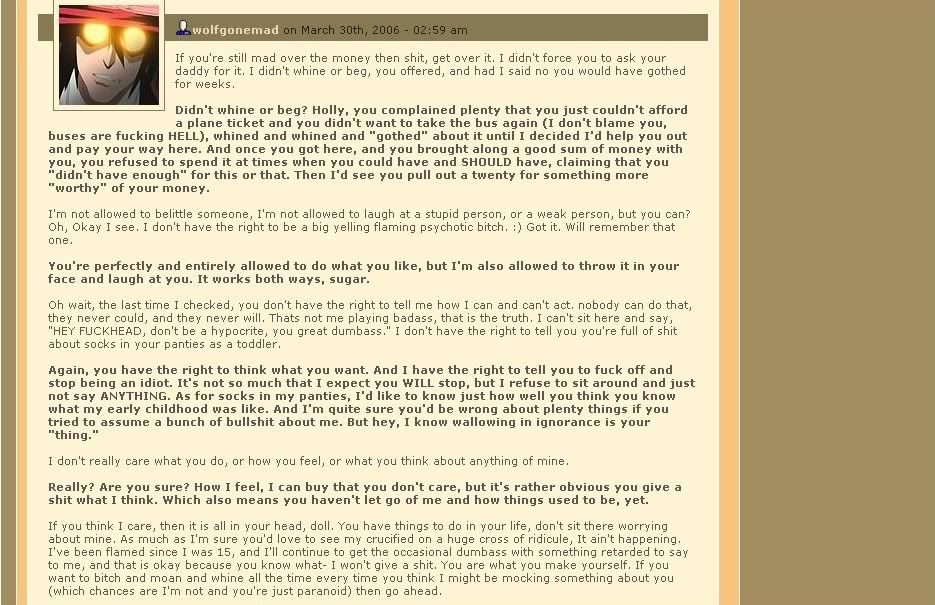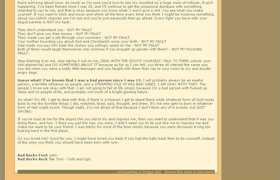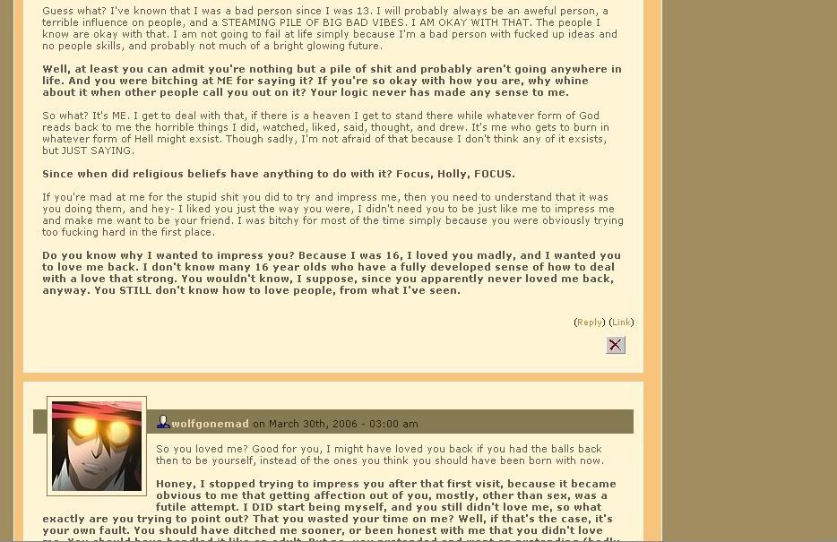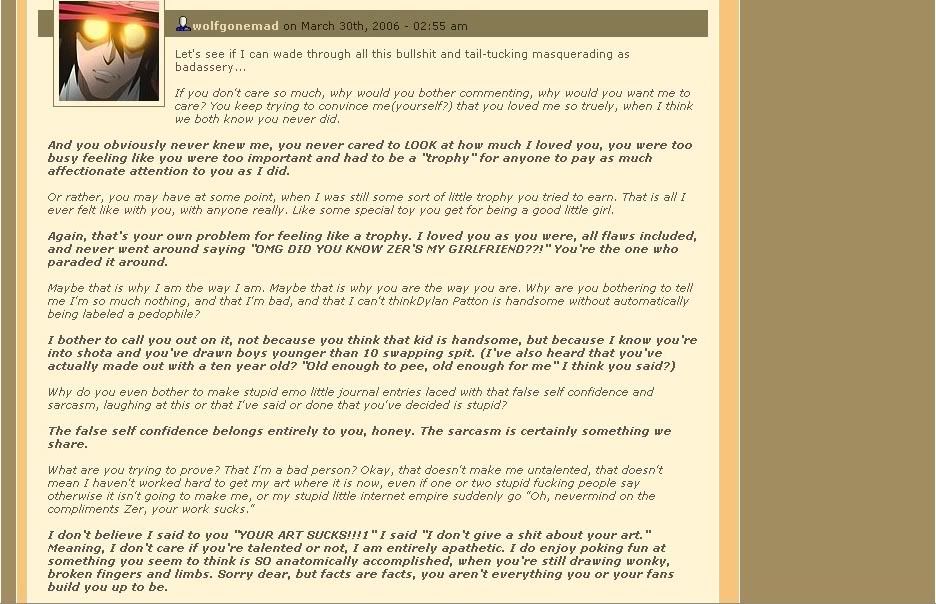 On her new, seriously shit-faced 'art galleries' she complains about her ED entry and remarks "OH I HATE A LOT OF PEOPLE TOO BUT I SURE DON'T MAKE A WEBSITE FOR THEM." No Zer, you just go under anonymous LJ names to make attacks on people who refuse to lick your lard ass. Oh, and don't forget posing as one of your own fans and harassing people. Not to mention the DeviantArt charades...