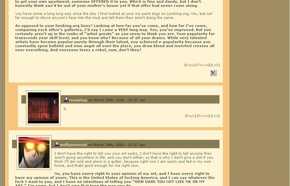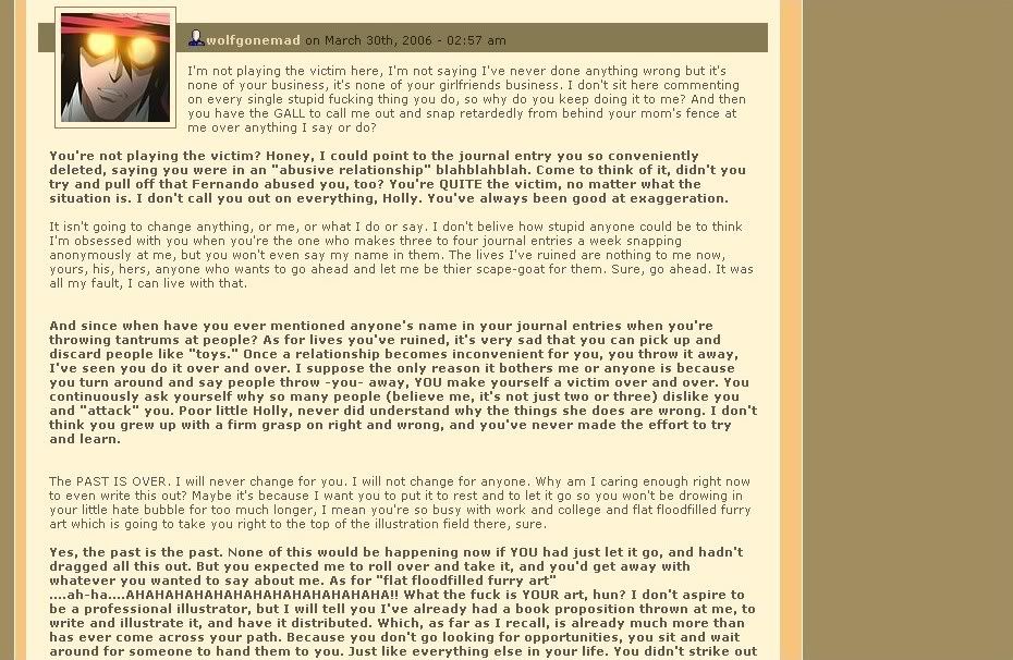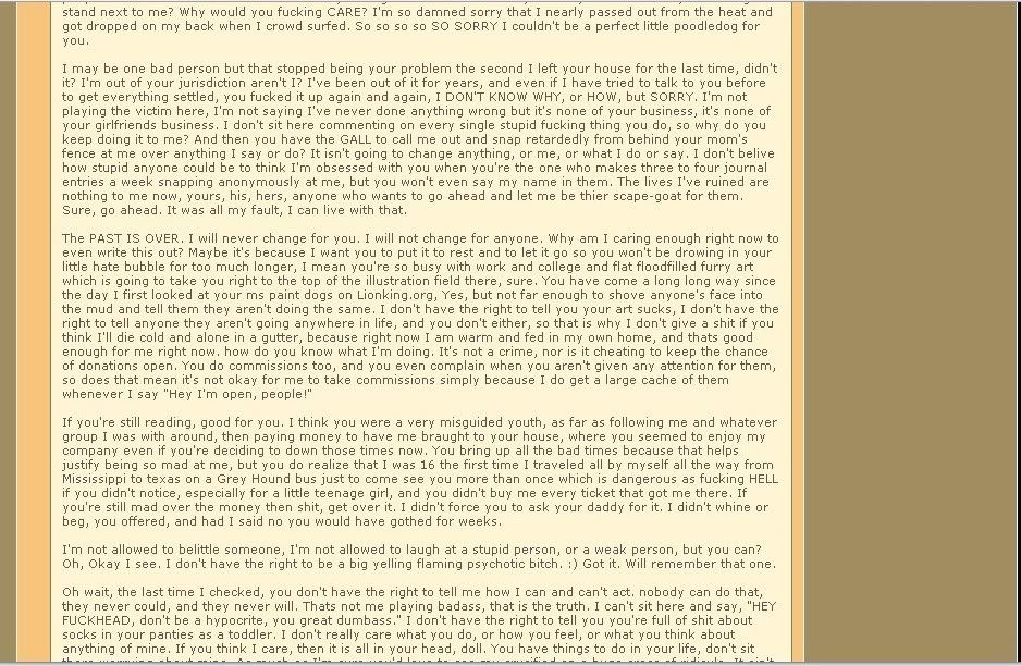 This used to be Zeriara's main way of spreading her drama, but unfortunately for her, times have changed. She is now permanently banned from the website, and spends her days updating her LiveJournal and her FurAffinity with pointless rambling or asking for cash. She also tends to complain on FurAffinity about how no one comments on her pictures. WELL GEE, I wonder why? Bear in mind she deletes any pictures when someone points out a striking similarity to another character she's ripped or otherwise criticizes the piece, and then she has to start the comment count again at zero. This system sorta explains the whole "complete lack of higher education" up there.