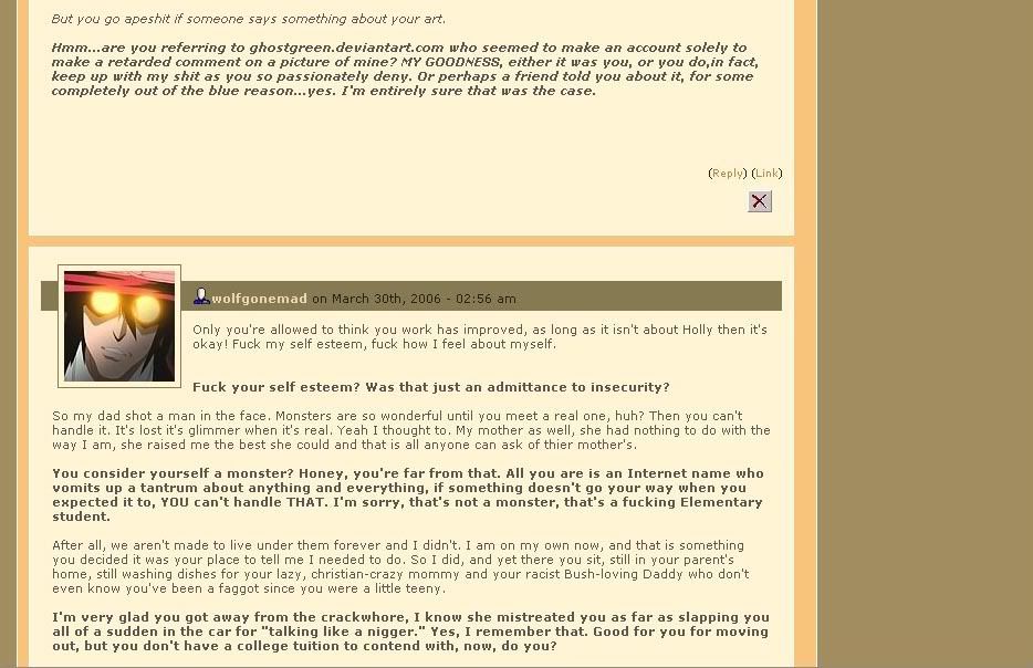 Before she was banned for faggotry she got into a bitch fit with a little teenage girl over her weight. It all started when she uploaded yet another masterpiece conveying herself to look much like a Pro-Ana girl. Zeriara is in fact a fatass but at the time refused to admit it. Even the 16 year old girl's boyfriend helped her to flame the fat Zer, but Holly insisted she could somehow transfer every stretch mark to another dimension, even going so far as to describe herself as a "SCRAWNY LASS." This resulted in a bunch of overweight Zer-fuckers flaming the troll on her userpage. The mission was aborted. As a final solution, she commented on Zeriara's page, remarking "HI FATTY! *waves*." This resulted in a mostly one-sided argument with her ego until she gave up and reported the teenage girl, thus proving her ultimate maturity. Sadly, this example is just one of hundreds of mini-flame wars over stupid, useless crap that Zer used to engage in all over DevianTART.