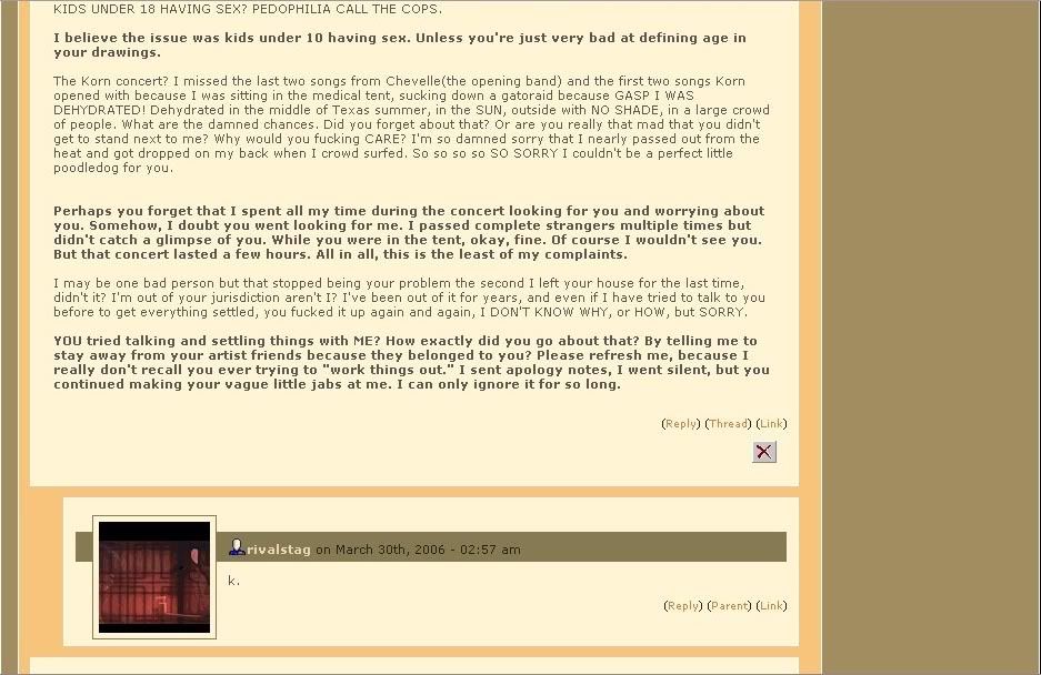 So why was she banned? She had been perma-banned in the past for drawing child porn (her kiddy-character Anton drooling semen, actually, which she claimed was actually bubblegum); however, after she and her hordes of masses flamed the help desk, they revoked it and gave her a second chance. Zeriara has blamed Snapesnogger for her ban, claiming her single comment on a journal got her permanently banned. Does that make much sense? Didn't think so. She doesn't want people to know why she was really banned--around the time of her ban she was pissed off at Celena (pagedrillgirl) for having a world for her characters and stomping all over the Internets to harass others who also came up with this very unique concept. Even though Zeriara herself has Dembala, the ripped off world of darkness, and is the patron saint of harassing innocent upcoming artists, she could not stand this. So she "created" something called Semi Gudduss, a pun on Celena's Demi Goddesses. She invited anyone that happened to pass by her page to make one of these mockeries, and eventually the DA staff caught on after Zeriara tripped over her own lies and couldn't keep the story straight. This is what led to being banned for harassment and ended her DeviantART adventure.