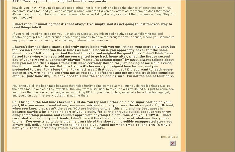 Zeriara was a busy bee, pitting any lackey she could against her old friend, making him out to be an abusive, unloving asshole who never did nothin' for her. Except for that plane ticket he bought to pay her way on one of her visits... and a big concert he took her to... and countless fanarts of her personal character... the list goes on and on and on and on.