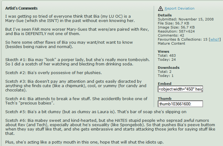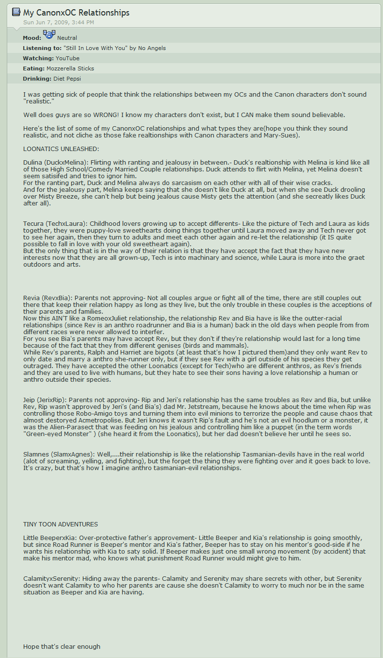 Sony-mae's mary-sues are mainly geared towards the Loonatics Unleashed crowd, which was a gay ass way to appeal to merge Looney Tunes and animu to appeal to the weeaboos, while ripping off X-men all at the same time. This had nothing to do with the original cast, but with their descendants or some crap like that. When original LT fan Spootay made a deviation mentioning, but not even giving a well-deserved bitchslap mention, her slaves and hoardes of fans decide to attack in a way resembling piranhas and Twilight fans.