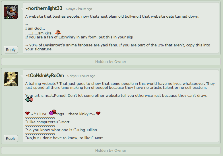 Of course this was accompanied by more hiding comments to those that happened to say something different than I AGREE U ROCK LEMME KISS UR ASS!!11
