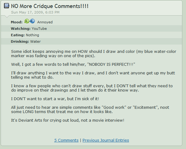 Sony-mae, being the kind of tartlet that always has to have her ass kissed by her fanturds, hates criticism. If she gets criticism she will rant about how she hates it like in the image above, because this is obviously a site to kiss her ass, and not for art. Sony-Mae will also hide your comments, so BEWARE. She will also delete journals if she realizes she's being pwn3d hard, SO GET TO DELETING, ANON.