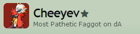 Cheeyev is the DeviantArt handle of newly-minted Lol-cow Elijah, a 15-year-old boy from the United States, who became notorious in late 2013 for being the most lulzy attention whore on the site since Chasethehedgehog. When he's not posting five journals a day whining about how much his life sucks, this emo fag likes to steal others' art. Oh, and he claims to have Asperger's Syndrome; surprise, surprise.
