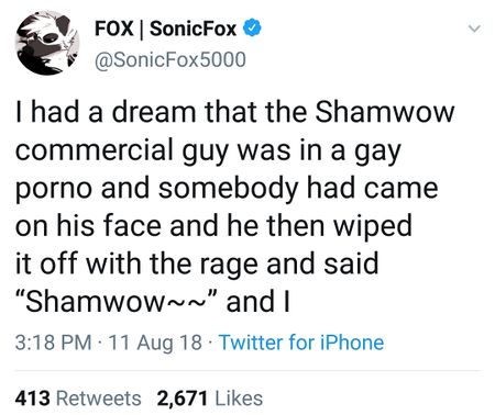 Despite having made close to 500,000 dollars playing video games, Sonicfox tends to think that being gay is a personality trait and not a life choice, possibly because he doesn't have one of his own that doesn't include claiming how 1337 he is, or how beaten down he is for being black and a gay bottom furry.