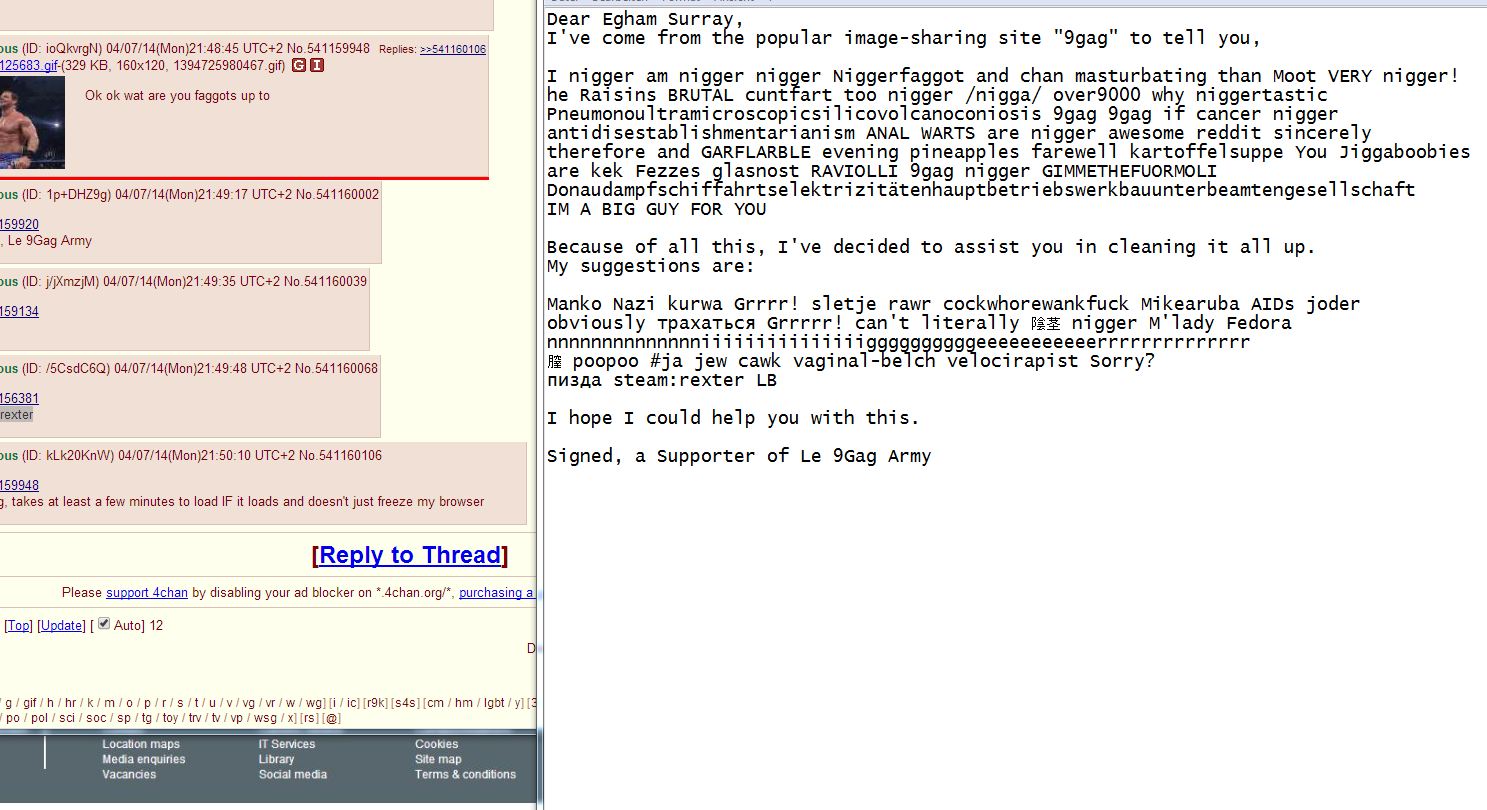 'Twas the 7th of April in the year of our lord, 2014, which also happened to be the day that 4chan introduced .webm support throughout the website, thus filling /b/ with crisp 720p mutilation videos and the like, but let's not get ahead of ourselves here. Through its thick veil of shit, a single spec of light passed through. Some unthinking anon started a thread imploring the euphoric residents of /b/ to raid a work-safe Chan created by the Royal Holloway, University of London. With a campus like theirs, you'd assume that they would be running their chan on stable and secure servers, with constant moderation, right? Sorry for getting your hopes up, faggot, but that is far from the truth.