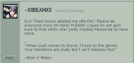 One of her mindless zombie fans wrote a depressing, suicidal, epic poem for their precious blair/bean, once they found out she was gone, they broke down; http://www.fanart-central.net/chapter-74826.html