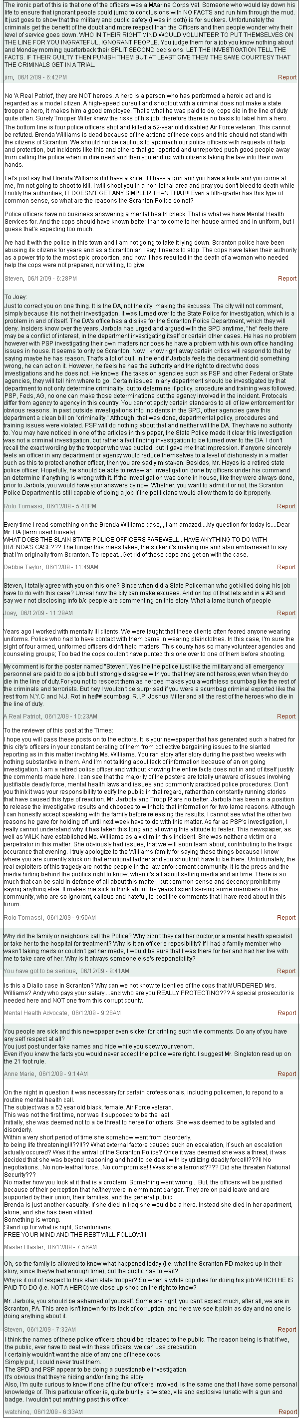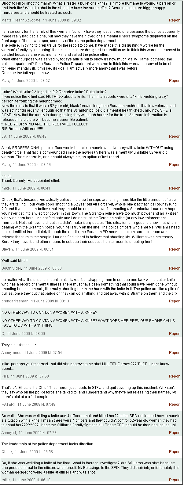 Even in death, Brenda Williams extended great dignity and power to those who found themselves in her presence. At eternal rest in her coffin in the sad hour before her funeral service, her face reflected a silent grace, offering quiet solace for those who stood before her to pay a final respect. Scranton police shot and killed Williams last week in her second-floor apartment after responding to a report of a disturbance. Details are sketchy while Pennsylvania State Police conduct an investigation. Williams wielded a knife, according to newspaper reports, although no police official has publicly confirmed that fact. What is confirmed is that Williams was a troubled woman who suffered from mental illness, a 52-year-old Air Force veteran who needed help. Instead, she found death at the hands of police. Standing before her coffin yesterday, I looked at the photograph of Williams that family had balanced against the soft casket satin. Wearing a big smile, Williams posed in her military uniform and seemed to have the world at her fingertips. Looking at her folded hands, I knew that her fingertips now remained still forever. No more would she tickle the keys of the alto saxophone she once played so well. No more would she hold her daughter who sat in the front row of the church during services with wet tears streaming down her cheeks. Now the city where Williams lived all her life will forever frame a tragedy that left her in a pool of blood that poured from her body when the gunfire stopped. Four Scranton police officers remain on paid leave until the investigation is finished. Williams is dead and gone. But the power of community that speaker after speaker stressed during her funeral remains. That power serves as a beacon that guides the search for truth for the many God-fearing family members and friends who now expect answers to the many unanswered questions that make Williams’ death all the harder to understand. Too many versions of what happened are circulating throughout the city. And there is no way to avoid pointing out the stark fact that four white men killed this black woman who might have lived if only the professionals on the scene had found another way. Second-guessing the cops will draw criticism. But unless we second-guess the cops this sad and violent act might happen again. PSP will hopefully second-guess every move the officers on the scene made. Unless that happens another mentally ill resident of this city might fall in a burst of bullets that with training might be avoided. Scranton police simply do not receive enough training to handle what cops call EDPs, emotionally disturbed persons. Standing in the rear of the church yesterday, I listened to a wise church elder and former pastor reassure the congregation that the truth will set us free. “If it doesn’t come out in the wash, it will come out in the rinse,” he said to laughter that broke the somber tension that filled the church. I sensed a growing confidence that will be necessary to take on the system that I expect to be less than forthcoming with the answers that are required for everyone to learn from what Williams’ brother called a “senseless” act. Yesterday, Williams’ lifeless body helped provide power to those who felt her spirit, a power that will be imperative for those who want to carry the torch of truth and shine it on every incident where police respond to a call for help. Death often nurtures the quest for social justice. Sometimes enemies become friends. Sometimes friends become enemies. In this case, the end must become the beginning as we ask ourselves over and over again, “Who speaks for Brenda Williams?” We must look ourselves in the mirror and ask if we truly care about each other and about the city we love. We must reflect on what went wrong last week. We must promise to do our best to help rather than hurt. Williams now dwells in what a pastor yesterday called “her mansion.” We must now ask ourselves what we plan to do about this sad and violent place that we call home. Life and death hang in the balance of our response. [[TL;DR]] '''Summary:''' Four cops killed an alleged /b/tard with a knife and got away with it. [[Whambulance|WHAAAAAAAAAAAAAAAAAAA]]