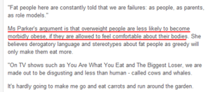 She originally wrote about her surgery on the fat activist site Shapely Prose and naturally was met with hostility from people who felt that being a grotesque distortion of the human form unable to perform even the simplest and most basic acts of self care made her the ideal role model for their movement. The role model, of course, being early death and crappy life full of cake and crying.