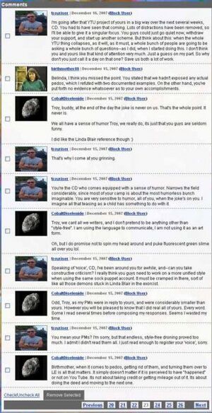 So now his specialty is pedophiles, and he pisses them off like noone else can. Whenever he makes a video, the pedos come out of the woodwork, generating massive amounts of butthurt, and lulzy comments on tap. Here's a small list of just some of the tubers that hate Troy Riser's guts: