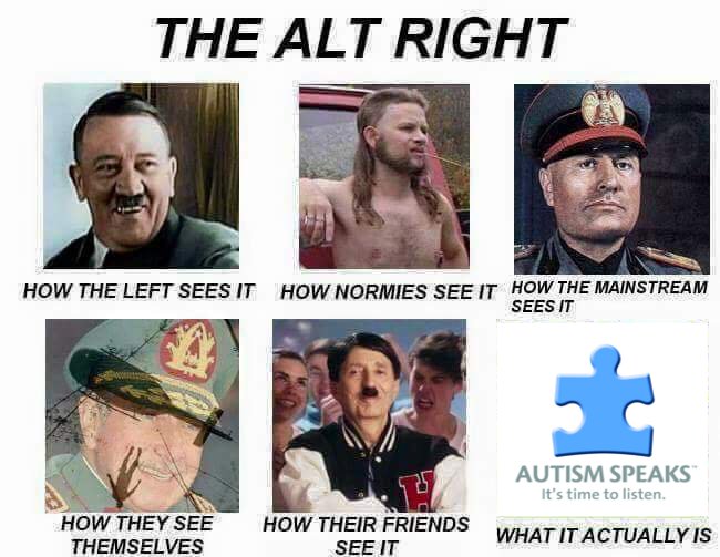 Alt-right (alt. CIAlt-right, salt-right, aut-right, far-right SJWs) is a fascist ideology whose adherents have achieved absolutely nothing of value, have no discernible skills or merit as human beings, and therefore put pride in their race above all other things (sound familiar). Their whiteness is the one thing that can never be taken away from them, yet also is the one thing that took no effort whatsoever to possess, thus giving them a completely undeserved sense of superiority over ethnic minority individuals, many of whom have accomplished far more than they ever will.