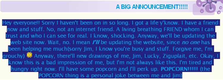Anyway, as some of you know my cousin Jim is coming here this June and I'm trying to make the house look good 'cause we do this kinda roleplay game where we pretend to be our characters and go on very weird adventures and stuff... anyway, I made this new idea that the characters have a club, called Club Chaos, and almost anyone can join Club Chaos, but there are 5 presidents of the club; Danielle, Jim, Shadow, Lucky, and Paul. Anyway, I made the pics of them because I made them to print them out and tape them to a little box, that now is hanging in the back room of my house that is Club Chaos, it's just a little box with all of the Club Chaos main members on it, Danielle, Jim, Shadow, and Lucky on the four sides, and Paul on the bottum. That's the only reason I made the pics.... That's all."