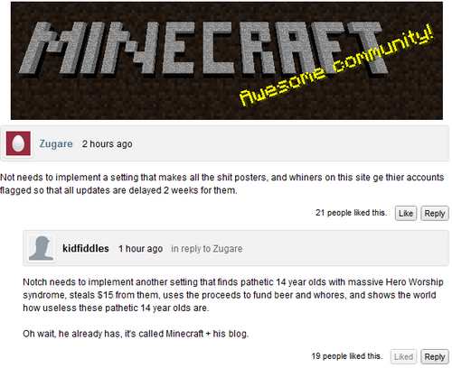 Obviously this creates ample trolling possibilities, but members of the community have over-compensated to the point where anyone who simply disagrees with someone's comment is labelled a "troll." Ironically, this hyper-sensitivity makes trolling even easier. Sometimes it seems that even Notch trolls the community, such as when he delayed a "Secret Friday Update" to play Civ 5 instead.